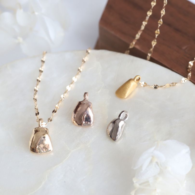金乳歯の造形美を最も象徴的に引き立てるプレミアムペンダント。花びらのような「ペタルチェーン」が上品な光を添え、金乳歯のチャームをやさしく引き立てます。 特別な日はもちろん、普段の装いにも合わせやすいデザイン。お子様への想いを、いつでも胸元で感じていただけます。