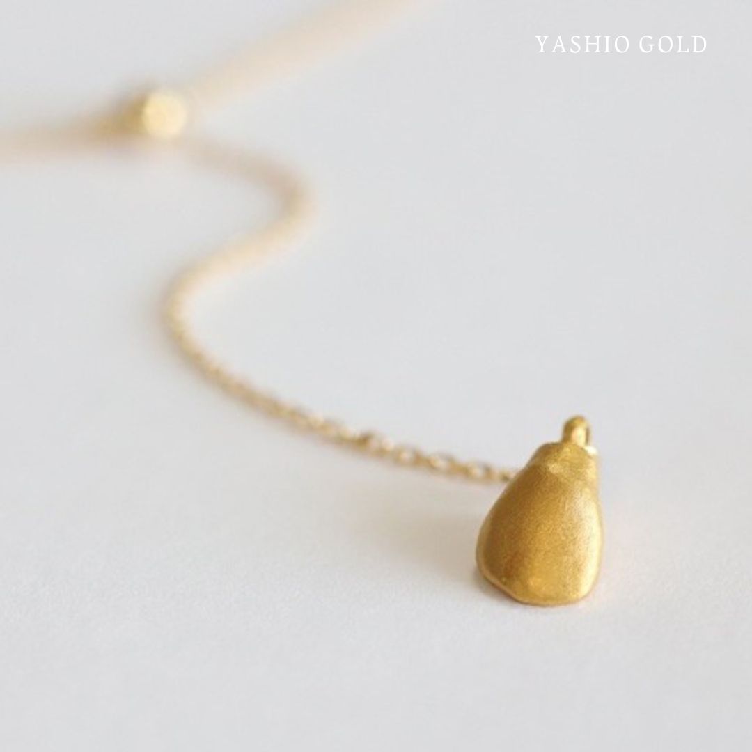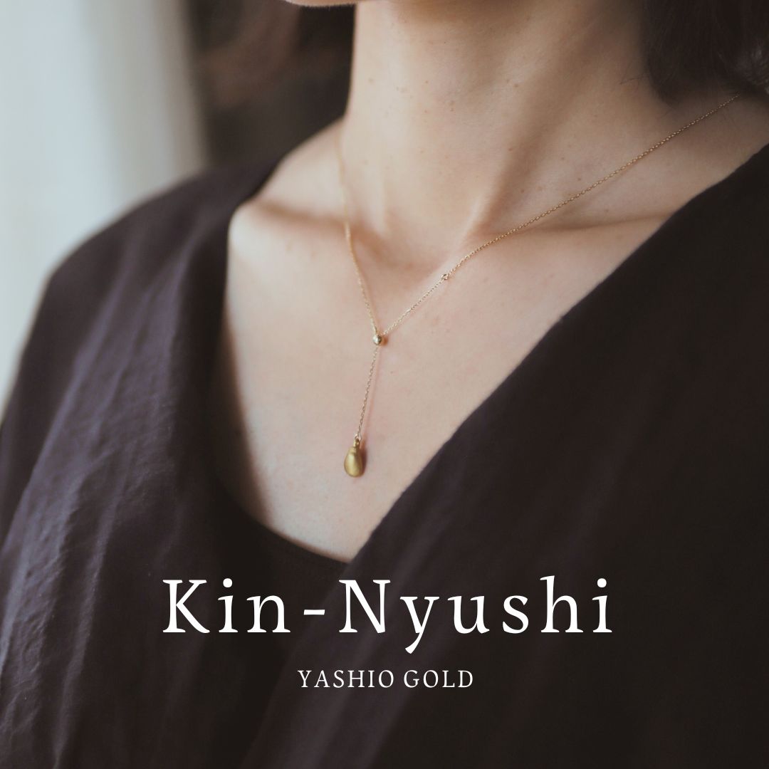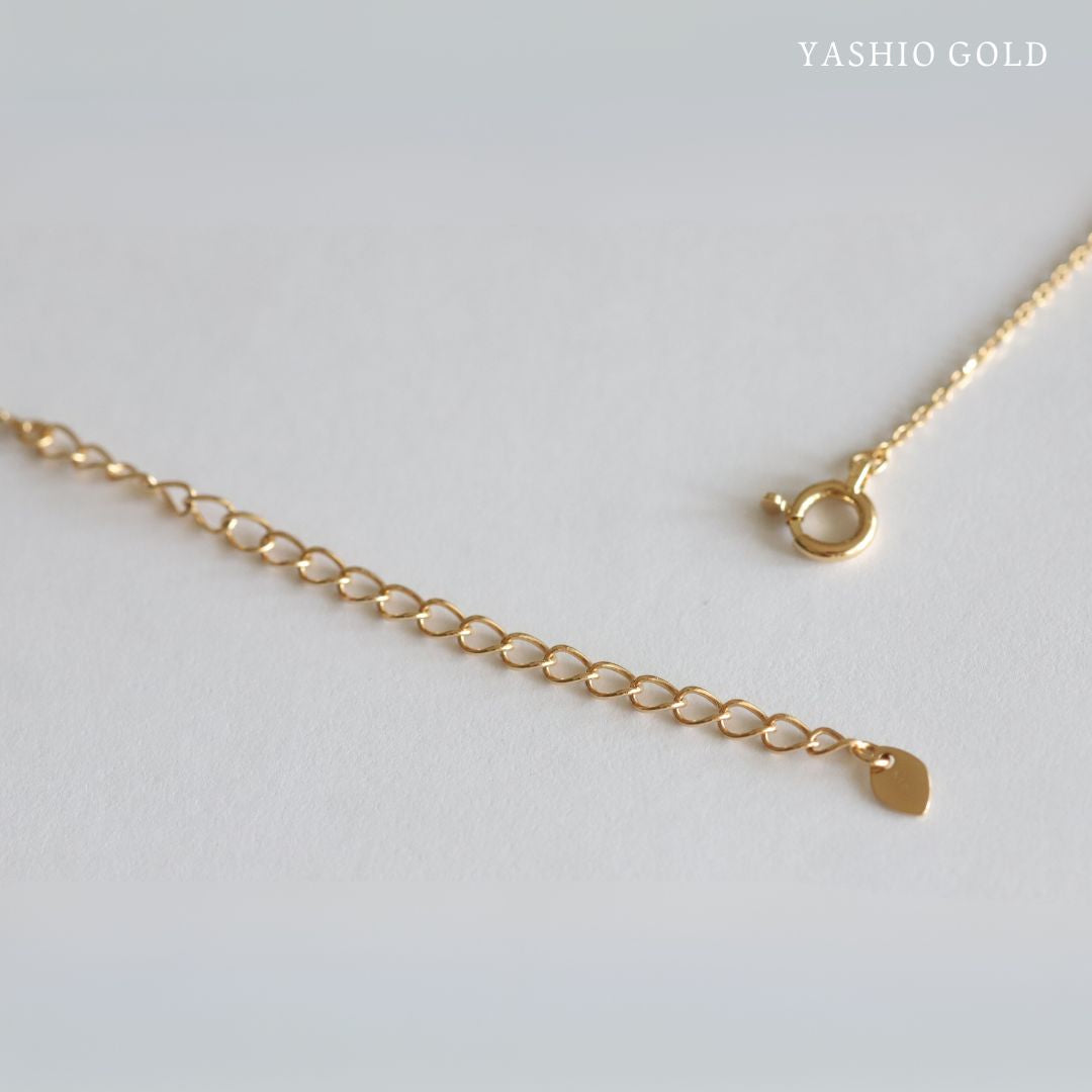 胸元で縦に流れるラインが印象的なY字シルエット。金乳歯のモチーフが、揺れるたびに繊細な輝きを放ちます。顔まわりをすっきりと見せるデザインは、スタイルを選ばず上品なアクセントに。