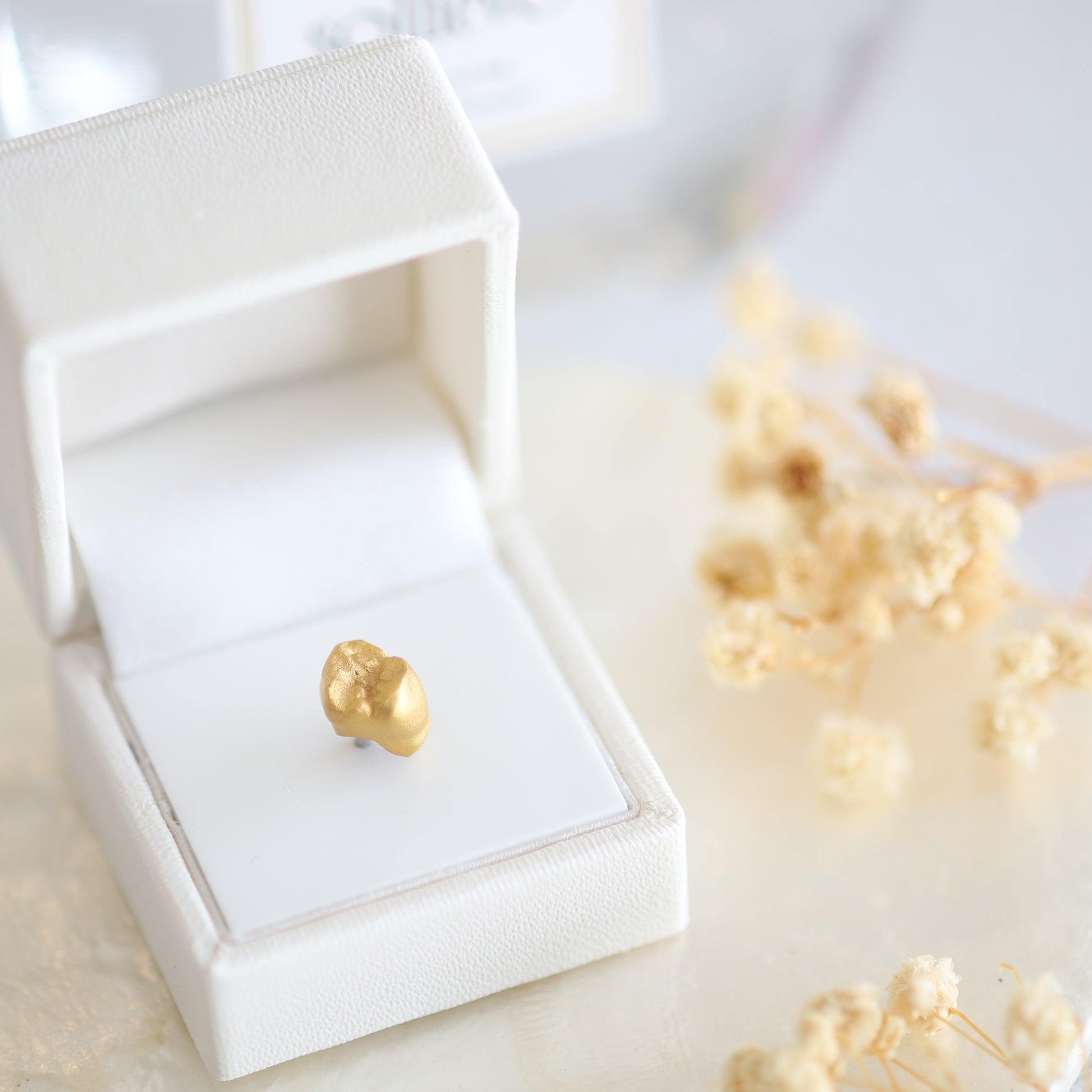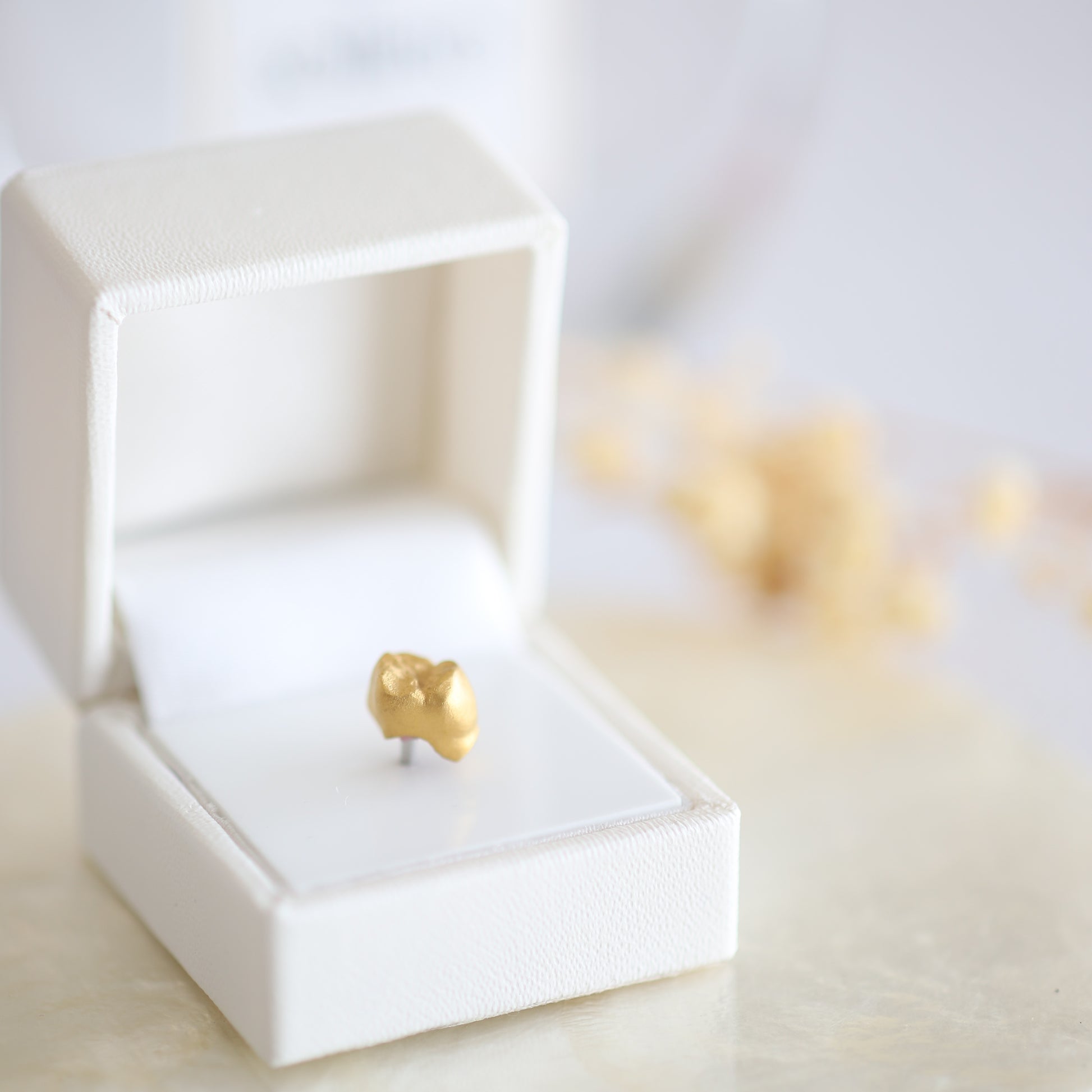 ジュエリーBOXは金乳歯が立体的に見ていただけるように、金乳歯をピンに挿入する手法を採用しています。(木製の金乳歯専用ケースは付属しておりません)