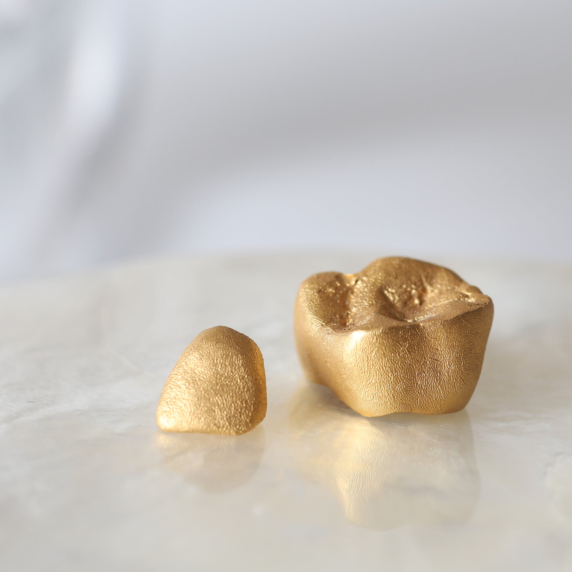 金乳歯は、歯科技工士により一つ一つ丁寧に製作された純金製のオブジェで、お客様からお預かりした乳歯を同じ形・同じサイズで精密に再現します。